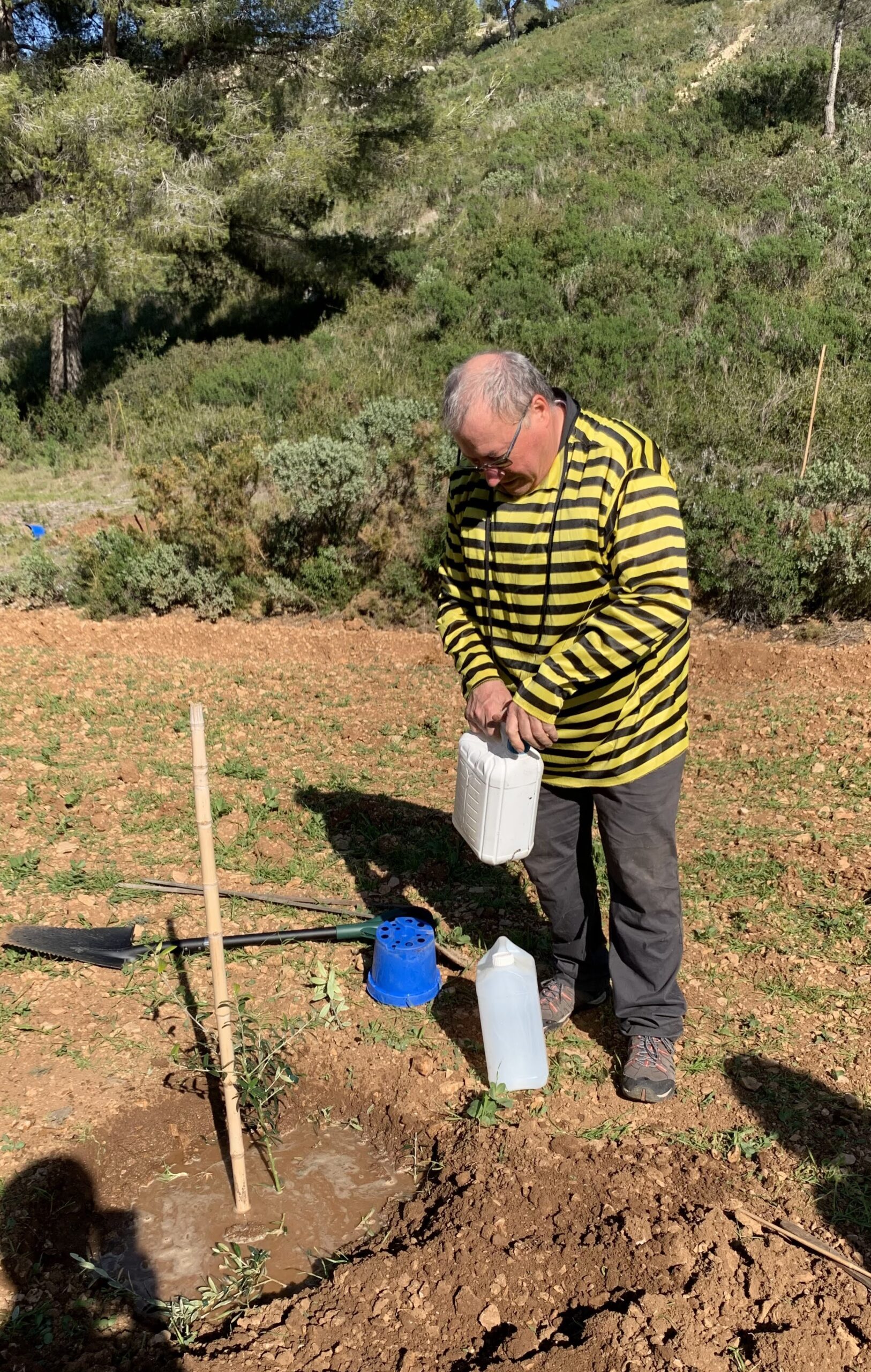 Distribution d’eau … Apports en bidons de 5 l, 10 l, 20 l, c’est fou ce que cela boit ces plantes là ! Merci à Christian TERS le porteur d’eau !