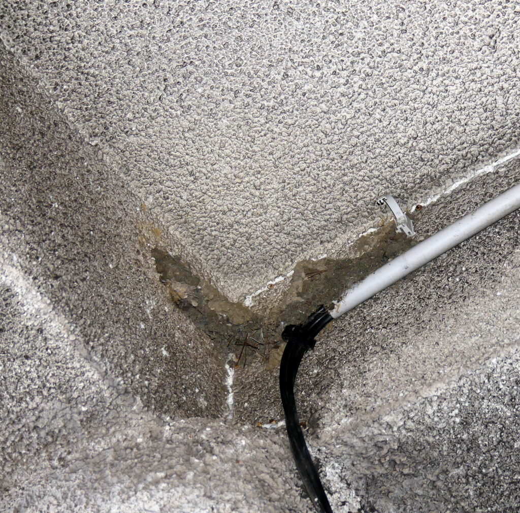 Ce nid a hébergé 2 hirondeaux en 2025, qui ont eu bien du mérite à ne pas tomber du nid, celui-ci laisse voir des tentatives de renforcement, des aiguilles de pin mais il ne sera plus utilisé en 2026 car il y aura un arrêté municipal de mise en péril !