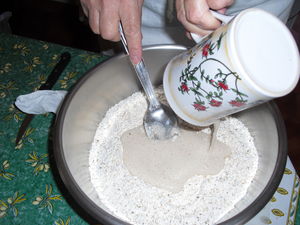 Dans un bol, mettez la levure et l ‘eau tiède, laissez lever.