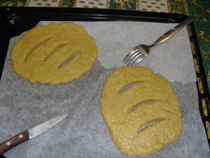 Aplatissez en forme ovale, faites des entailles, NDLR pour aplatir j’utilise une seconde feuille de papier de cuisson